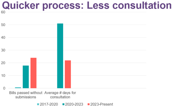 More Bills are being passed without a select committee process, and where there is a select committee process, the average submission window has dropped from around 51 days to 22 days.
