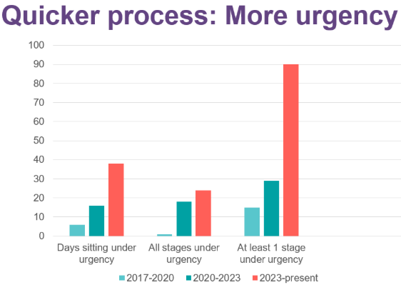 Looking at the first 18 months of the last three governments, we saw a rise in the number of days the House sits under urgency, an increase in the number of Bills passed entirely under urgency, and a jump in Bills where at least one stage was passed under urgency.