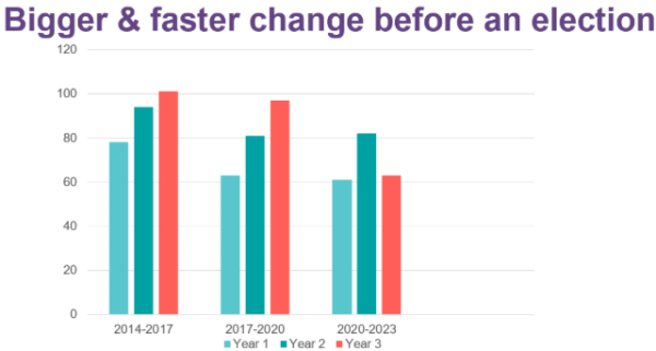 The 2023 election year bucked this trend by number, but that year saw large and fundamental changes, including two Acts to replace the Resource Management Act, the Fair Pay Agreements Act, and the Water Services Entities Act. All three of these Acts have now been repealed.